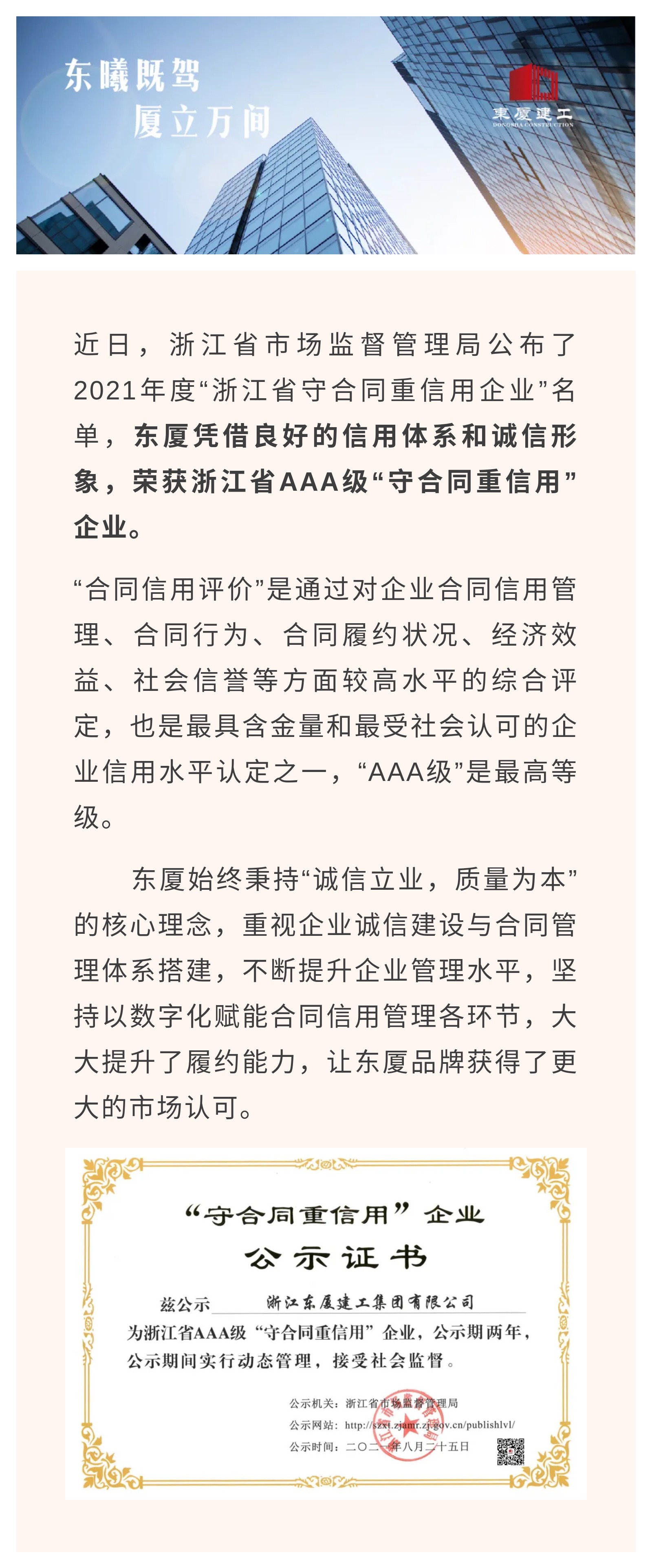 誠信立業(yè) 穩(wěn)健行遠(yuǎn) | 東廈建工榮獲浙江省AAA級(jí)“守合同重信用“企業(yè)””