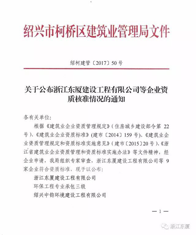 | 為進(jìn)一步提高公司綜合競(jìng)爭(zhēng)力,加強(qiáng)公司在經(jīng)營(yíng)投標(biāo)市場(chǎng)的優(yōu)勢(shì),拓展公司經(jīng)營(yíng)業(yè)務(wù)范圍。經(jīng)公司決定將承接環(huán)保工程業(yè)務(wù)作為我司拓展新領(lǐng)域,經(jīng)過(guò)前期的精心準(zhǔn)備,我司基本具備環(huán)保工程專(zhuān)業(yè)承包條件,近日,經(jīng)柯橋區(qū)建管局審核,我司成功取得環(huán)保工程專(zhuān)業(yè)承包三級(jí)資質(zhì),能承接環(huán)境工程也是公司為社會(huì)承擔(dān)的一份責(zé)任和力量。 我司在資質(zhì)管理方面將持續(xù)攀升,主動(dòng)出擊,克服困難,為公司長(zhǎng)遠(yuǎn)發(fā)展打基礎(chǔ)。