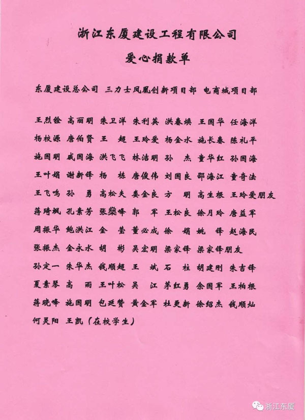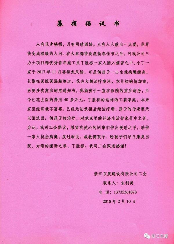 病魔無情,東廈有愛。丁勝標一家的遭遇牽動著東廈每個人的心,為幫助小丁家度過難關,我司工會率先發(fā)出了募捐倡議書,短短二天時間已籌集資金9萬余元。丁勝標家的困難也引起了鎮(zhèn)政府領導的關心,2月12日下午,楊汛橋鎮(zhèn)黨委副書記沈建祥和鎮(zhèn)黨委委員蔣利強代表鎮(zhèn)總工會前來我公司,送來了給丁勝標同志2000元的慰問金,帶來暖心的問候。 捐款和慰問金將由我司工會主席朱利英一并轉交給小丁,并傳達各級領導對他家的關愛。點滴的愛心匯成愛的暖流,祝愿小丁家倆孩子能危為安,度過難關。