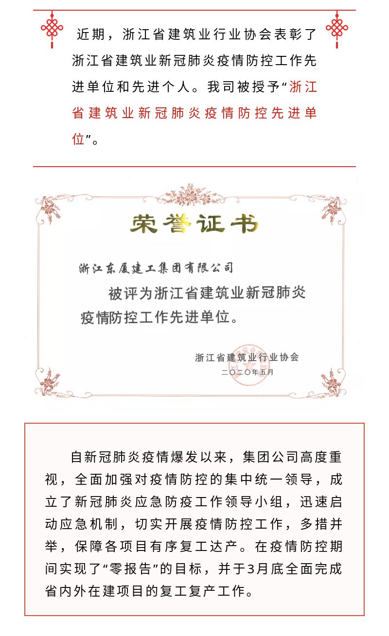 公司榮獲“浙江省建筑業(yè)新冠肺炎疫情防控先進單位”