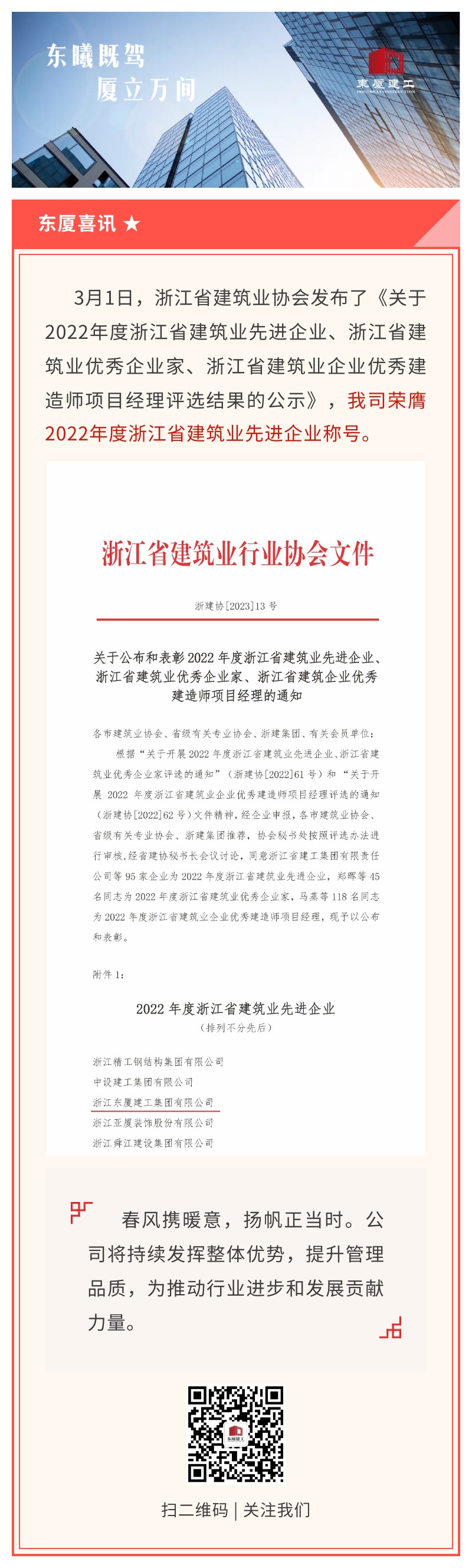 喜訊!公司榮膺浙江省建筑業(yè)先進企業(yè)的稱號